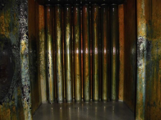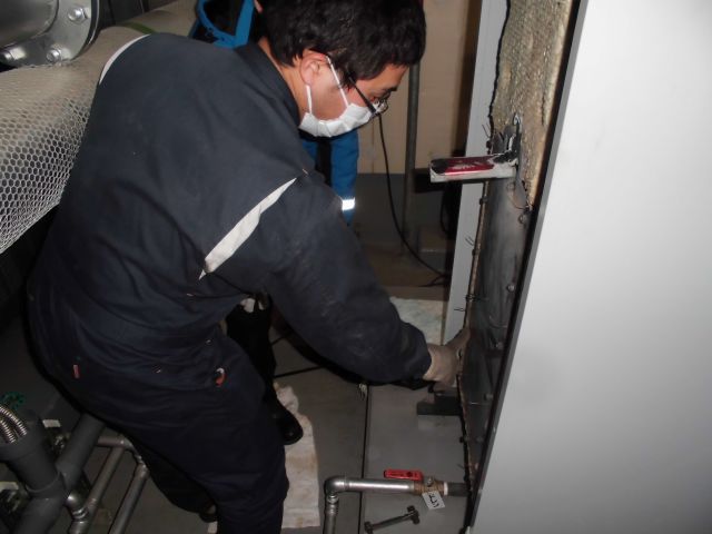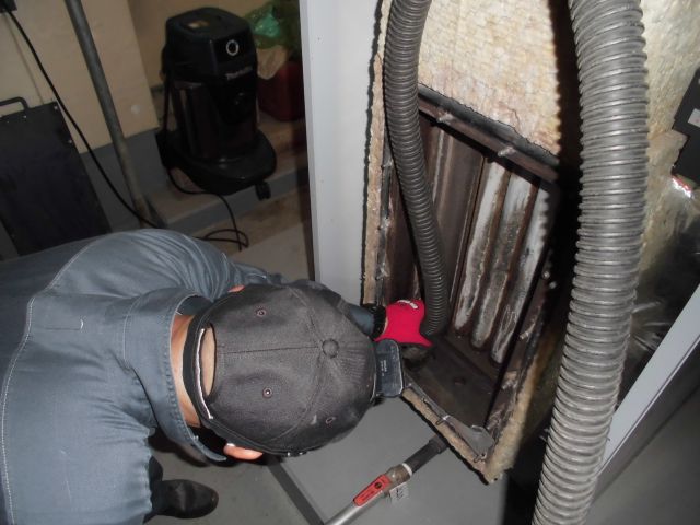 まずはバーナーを取り外し、バーナーの分解清掃を行いつつ、バーナーを取り外すことによって見えるようになる缶体内部の清掃を並行して行うため、ボイラーのメンテナンスには2~3人の人数が必要となってきます。